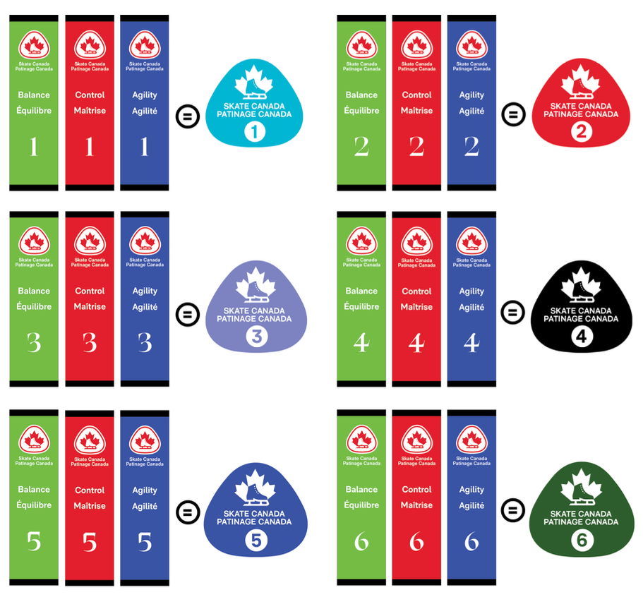 CanSkate includes six stages that guide a skater from the basics to more advanced skills. Each stage has ribbons and a badge. Skaters earn these as they demonstrate the required skills.